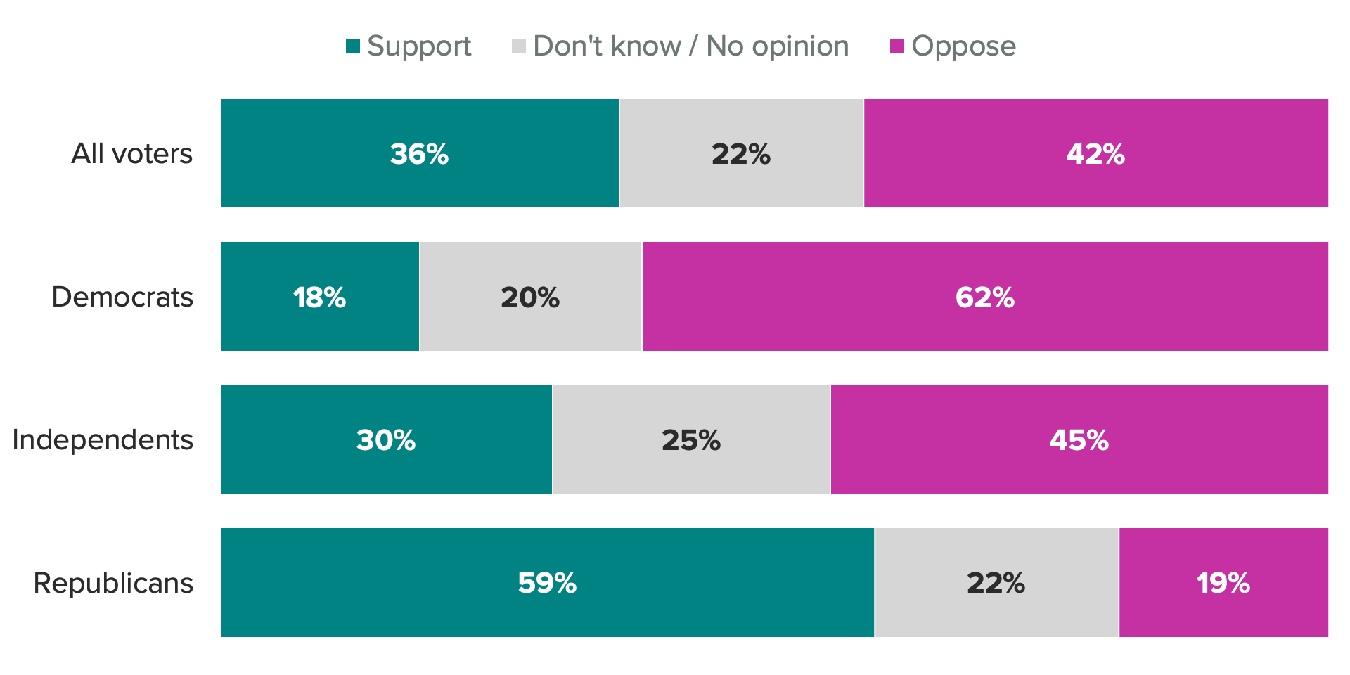 Our latest survey shows that 42% of voters oppose Trump’s new requirement that U.S. employers pay $100,000 per H-1B visa petition in order to recruit highly educated foreign workers, compared with 36% who support it. Democrats are roughly as likely to oppose Trump’s move as Republicans are to support it (62% to 59%), but 22% of voters — including similar shares on both sides of the aisle — don’t have opinions about the matter. The relatively weak views on this specific issue within the immigration discussion follows our research after the November election that showed voter sentiment on legal migration has not hardened during the Trump era despite the public’s toughened views toward illegal immigration. Most voters don’t think there are too many high-skilled workers here — including most Republicans. More broadly, voters of all political stripes are more likely to think Trump should make stopping illegal immigration a “top priority” than a reduction in legal immigration. As Trump’s focus on legal paths to entry grows to potentially include “F-1 student visas that serve as a critical pipeline to the tech workforce,” per Bloomberg News, he’s not really meeting political demands of the public, or a large chunk of his own party’s voters. For businesses reliant on these high-skilled foreigners, the public’s meager awareness of the matter may allow Trump to fly under the radar with his plans. Their best bet may be to hope that Trump’s and the public’s attention turns back toward his bread-and-butter issue of illegal immigration as the country prepares for the midterm election year. See what voters think about Washington’s approach to immigration and more. |