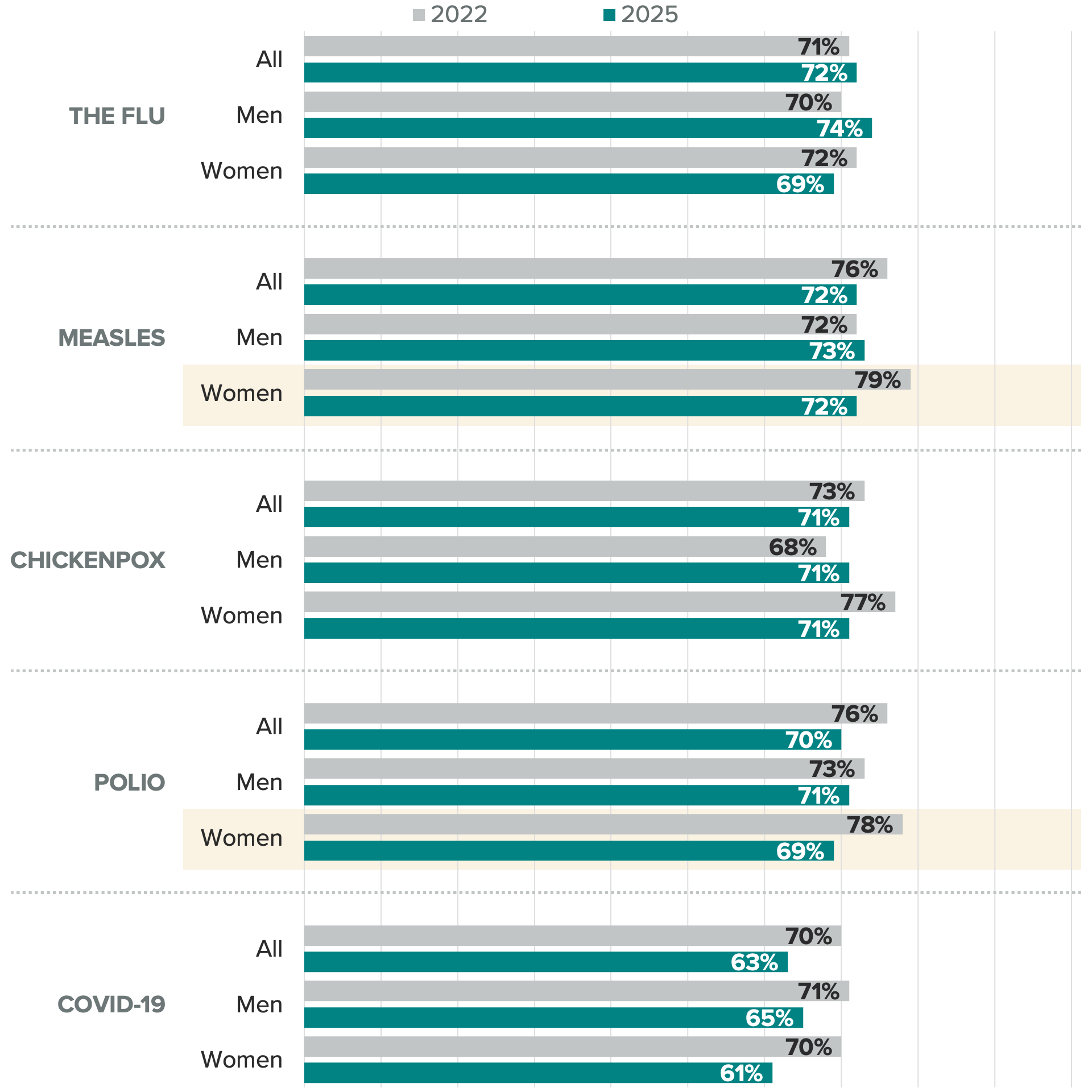 Since 2022, women have become less likely to say vaccines are important for illnesses such as polio (78% to 69%), measles (79% to 72%) and chickenpox (77% to 71%), erasing the gender gap in support for the shots that are mainly distributed to children. Among Republican women, the movement’s been even larger, including double-digit drops in the perceived importance of shots to ward off measles, polio and chickenpox. On the left, the movement among gender was less drastic. Democratic women are 9 percentage points less likely today to see the polio vaccine as important than they were in 2022 (84% to 75%), effectively matching where Democratic men stand on the matter. And Democratic men and women alike are 8 points less likely to see the COVID-19 shots as important, leading to a significant drop in the shares of Democrats who said they plan to get a booster in the coming year. While this data marks the latest proofpoint that the COVID-19 pandemic could in time be remembered as a crossing of the Rubicon for the frontier of public health, the information war over vaccines isn’t over, and the scientific community still has a chance to arrest the declining faith in inoculations. Read more from me here.